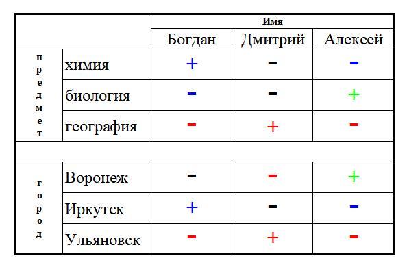 1. ставим плюс в строке биология в столбце Алексей (т.к. в строках химия и география в этом столбце стоят минусы - других вариантов нет)