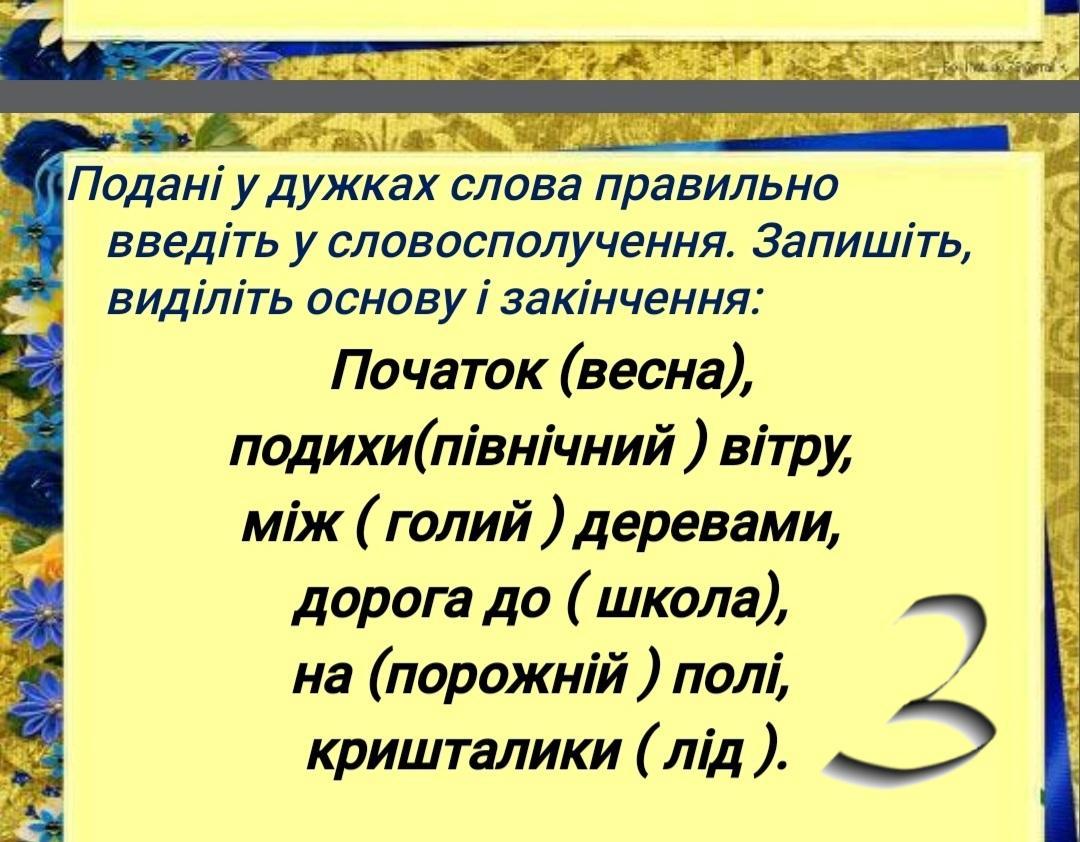 1) Початок весни, подихи північного вітру, між голими деревами, дорога до школи, на порожньому полі, кришталики льоду.