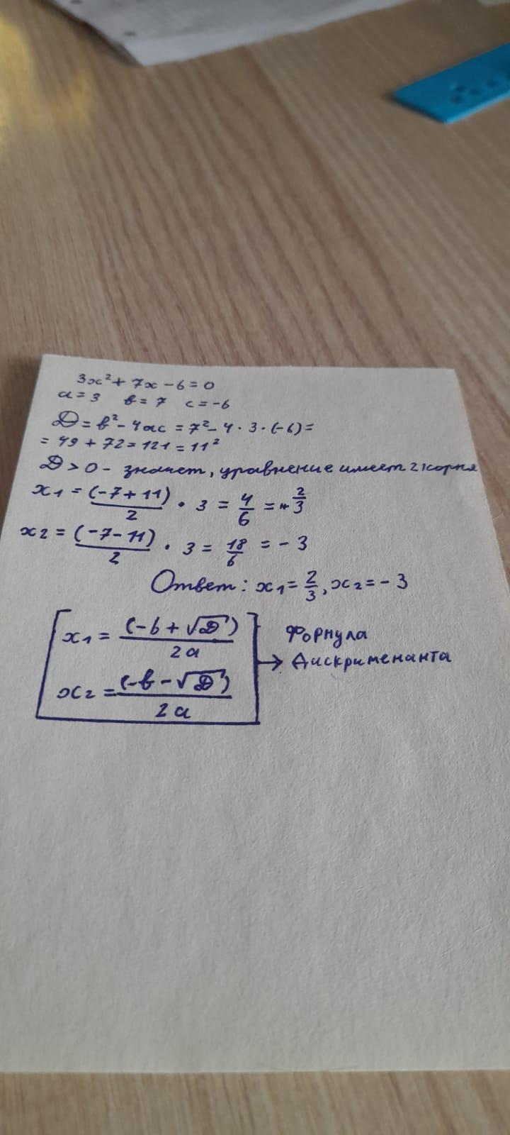 решим дискриминантом, D=7²-4•3•(-6)=49+72=121 x1=-7+√121/2•3 x1=2/3, x2=-7-√121/2•3 x2=-3