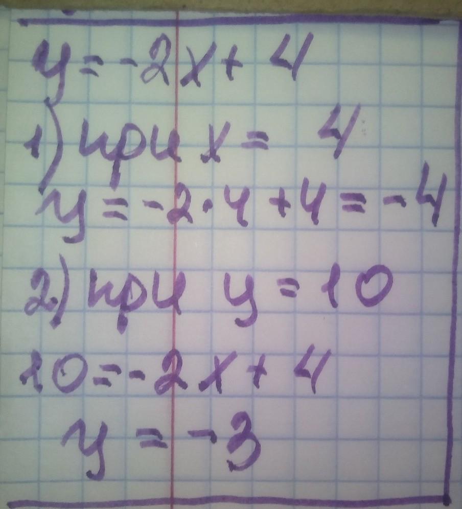 y= - 2x + 4 1) знайдіть значення функції якщо аргумент дорівнює 4. 2) знайдіть значення аргументу якщо значення функції дорівнює 10