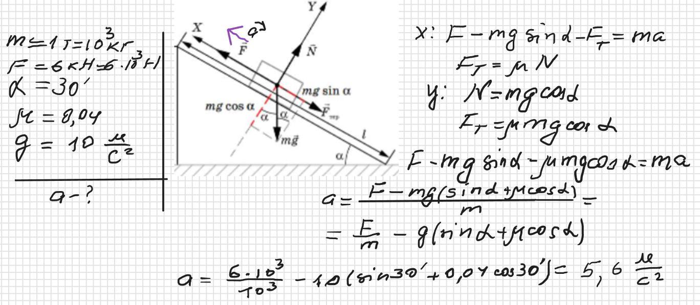 Автомобіль масою 1 т рухається під гору, розвиваючи силу тяги 6 кН. Визначте, з яким прискоренням рухається автомобіль, якщо коефіцієнт опору рухові дорівнює 0,04 , а нахил становить 30'.