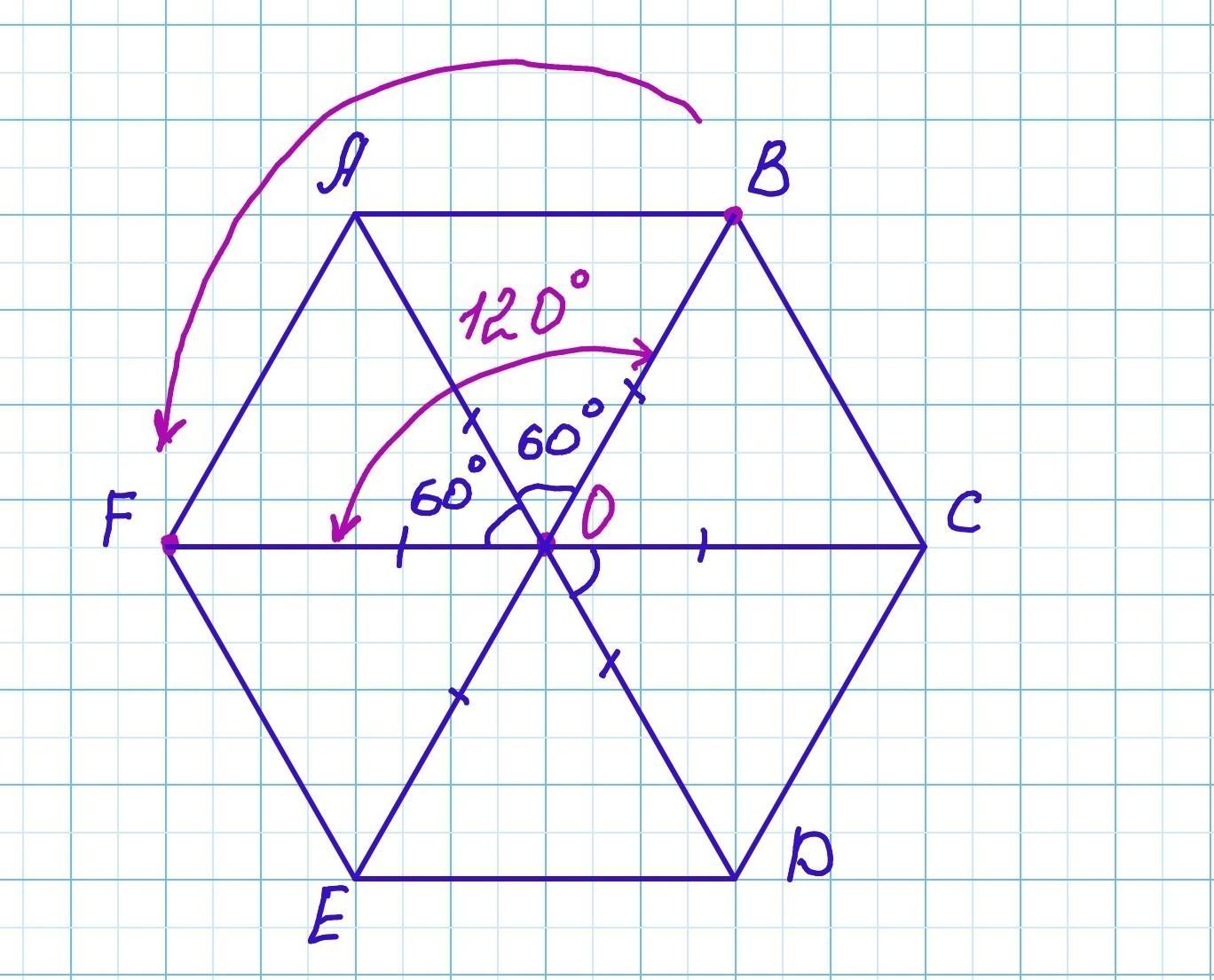 ABCDEF - правильний шестикутник. У яку точку при повороті навколо точки О на кут 120 проти годинникової стрілки перейде точка В?