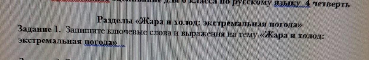 Разделы «Жара и холод: экстремальная погода» Задание 1. Запишите ключевые слова и выражения на тему «Жара и холод: экстремальная погода». очень срочно