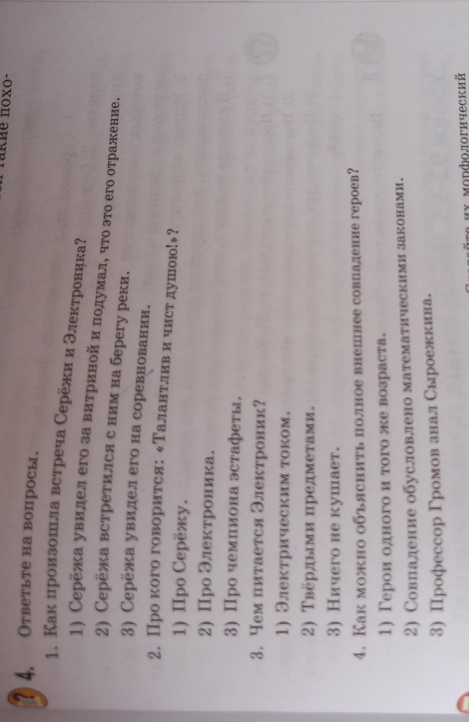4. ответьте на вопросы. 1. как произошла встреча серёжи и электроника? 1) серёжа увидел его за витриной и подумал, что это его отражение. 2) серёжа встретился с ним на берегу реки. 3) серёжа увидел его на соревновании. 2. про кого говорится: «талантлив и чист душою!»? 1) про серёжу. 2) про электроника. 3) про чемпиона эстафеты. 3. чем питается электроник? 1) электрическим током. 2) твёрдыми предметами. 3) ничего не кушает. 4. как можно объяснить полное внешнее совпадение героев? 1) герои одного и того же возраста. 2) совпадение обусловлено математическими законами. 3) профессор громов знал сыроежкина.