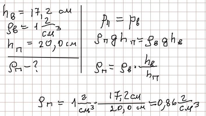 Стовп води у сполучених посудинах висотою 17,2 см зрiвноважує стовп дизельного палива висотою 20,0 Визначити густину палива. CM.