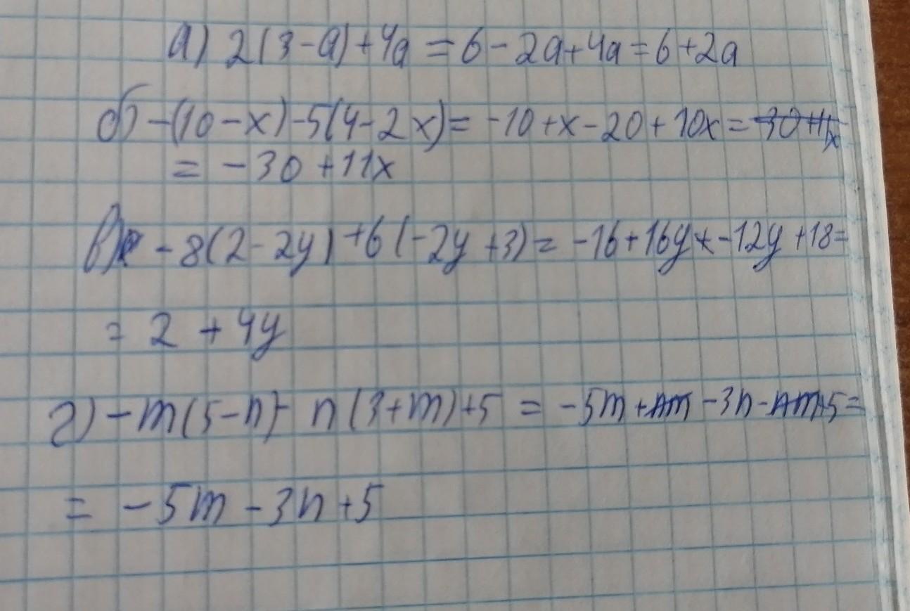 Спростіть вираз: ) 2(3-a)+ 4а ; -(10 - x) -5(4-2x); в) -8(2 - 2y) +6(-2y + 3); г) -m(5-n) -n (3+m) + 5.