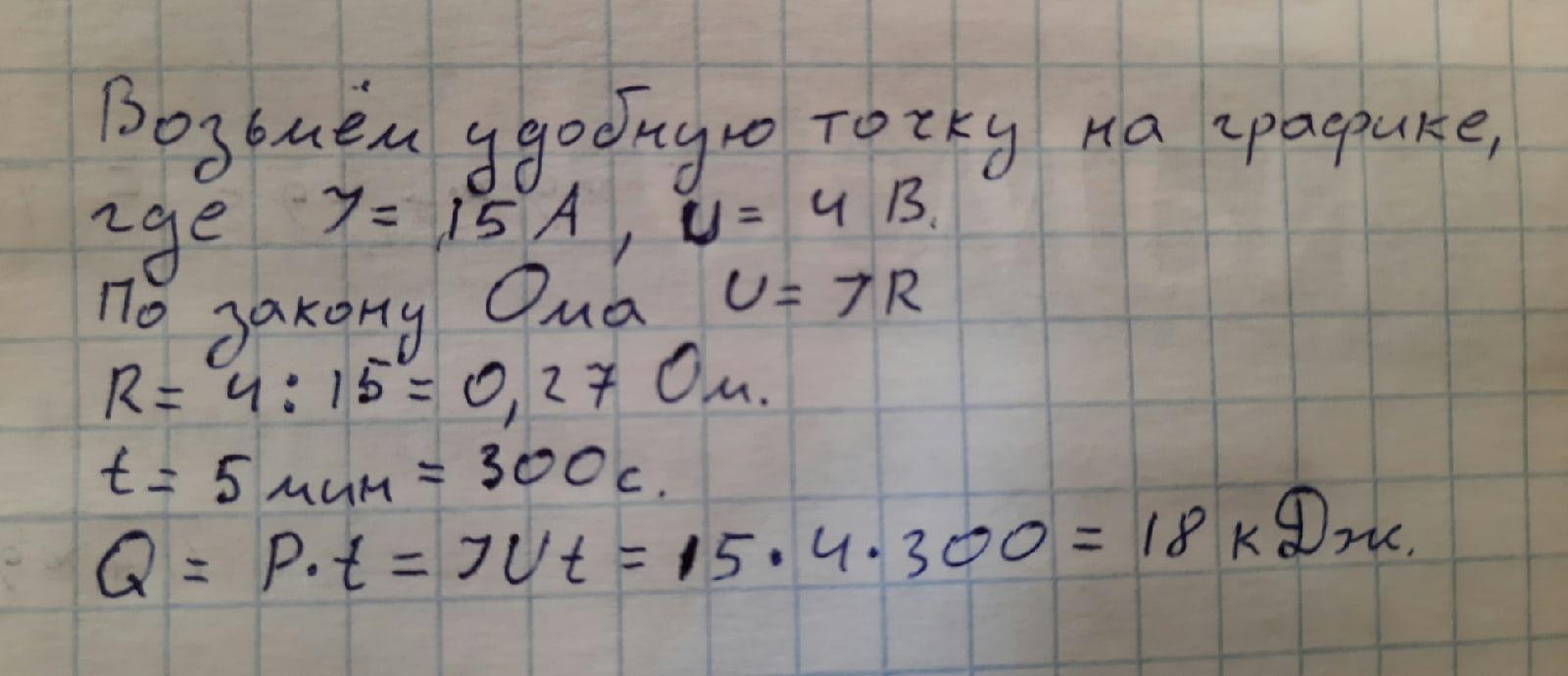 Помогите пожалуйста решить данное задание. Представлен график зависимости силы тока от напряжения для некоторого проводника. Воспользовавшись графиком, определите сопротивление этого проводника и количество теплоты, которое выделится на нём за 5 мин.