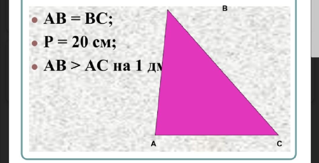 Пусть АВ = ВС = х. Тогда АС = (х-10) см, ведь в 1 дм 10 см.