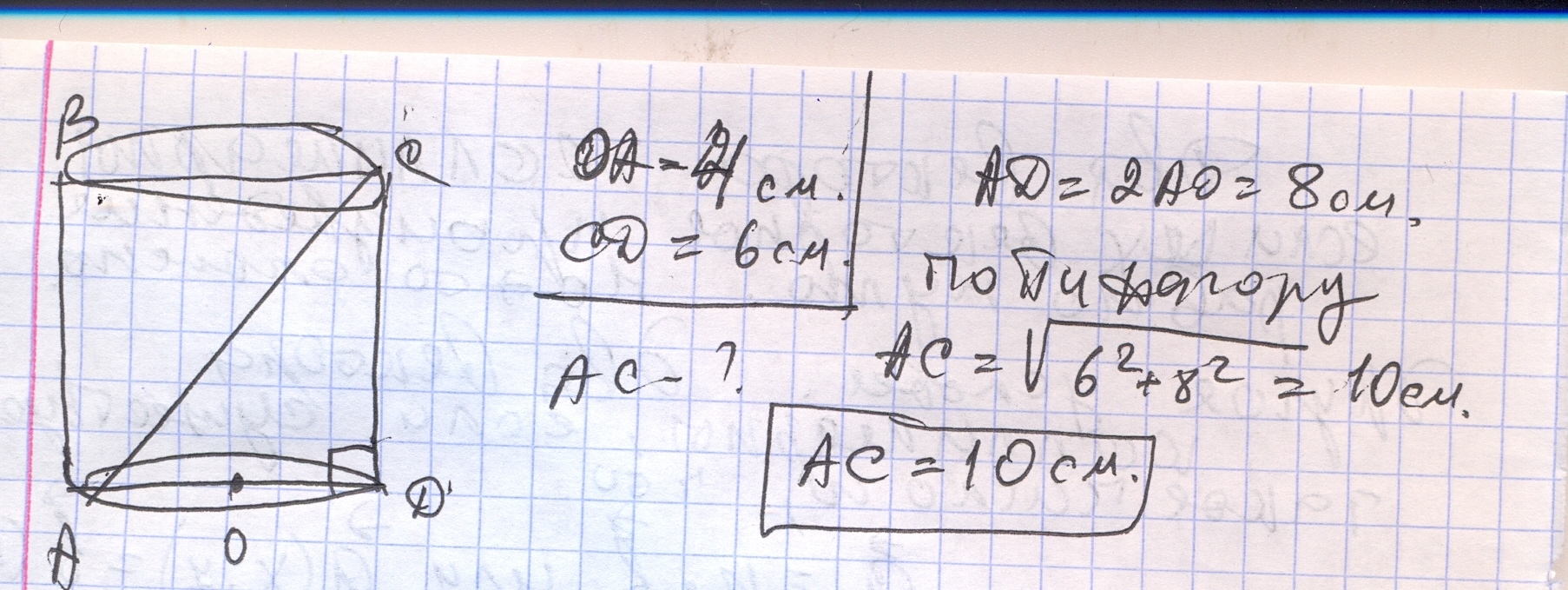Радиус основания цилиндра 4 м, высота 6 м, найдите диагональ осевого сечения