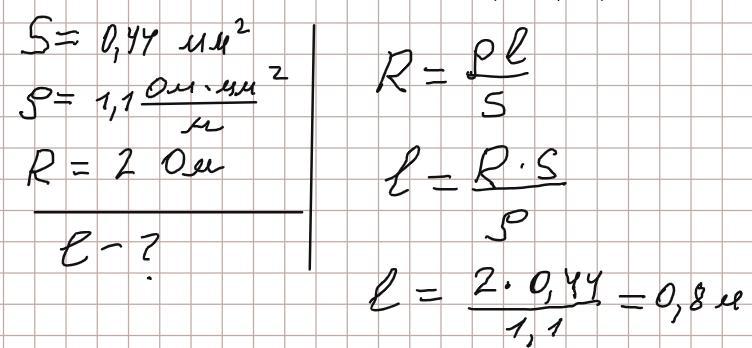 Площа поперечного перерізу ніхромового дроту - 0,44 кв.мм. Якої довжини треба взяти дріт, щоб виготовити резистор опором 2 Ом?