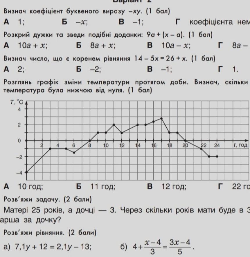 3. Визнач число, що є коренем рівняння 14 – 5х = 26 +x. (1 бал) A 2; Б -2; в –1; 4. Розглянь графік зміни температури протягом доби. Визнач, температура була нижчою від нуля. (1 бал) T, °C 4 2 о 2 6/8 10 12 14 16 18 20 22 24. -2 А 10 год; Б 11 год; B 12 год; 5 Розв'ами аnаuy 10 бап)ДАМ 40 БАЛОВ