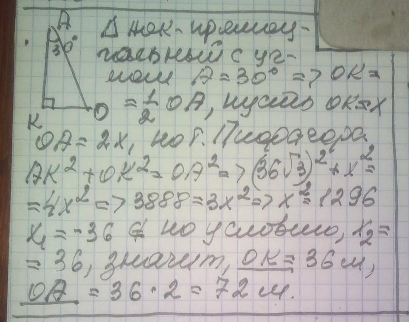 Вычисли второй катет и гипотенуза прямоугольного треугольника,если катет AK=36√3м и угол А=30 градусов.
