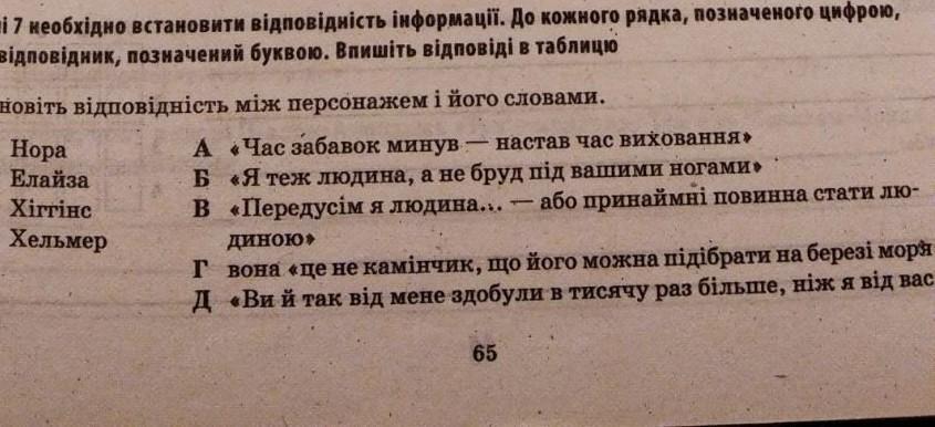1 Hopa 2 Елайза 3 Xiгтiнс 4 Хельмер A «Час забавок минув - настав час виховання. Г вона «це не камінчик, що його можна підібрати на березі моря Д Ви й так від мене здобули в тисячу раз більше, ніж я від вас Б «Я теж людина, а не бруд під вашими ногами. В я в «Передусім я людина ..-a6o принаймні повинна стати лю ДИНОЮ»