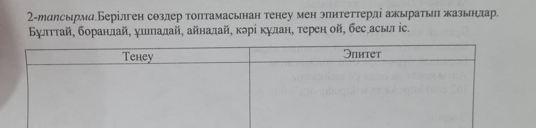 2-тапсырма.Берілген сөздер топтамасынан теңеу мен эпитеттерді ажыратып жазыңдар. Бұлттай, борандай, ұшпадай, айнадай, кәрі кұдан, терең ой, бес асыл iс. Тенеу Эпитет