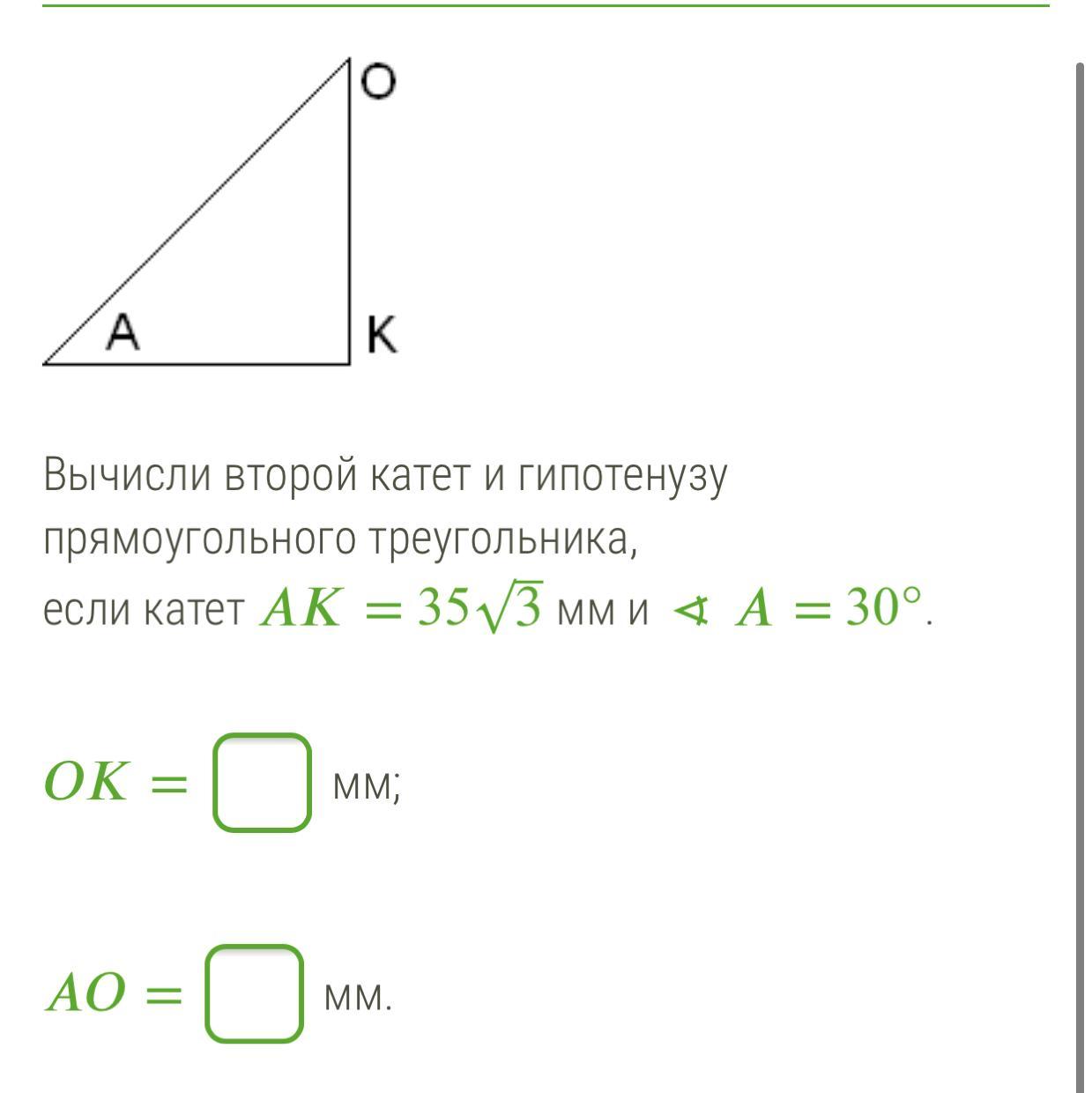Объяснение: ОK/АК=tg A ⇒ OK= AK·tg30°= 35√3 · √3/3= 35 (мм)