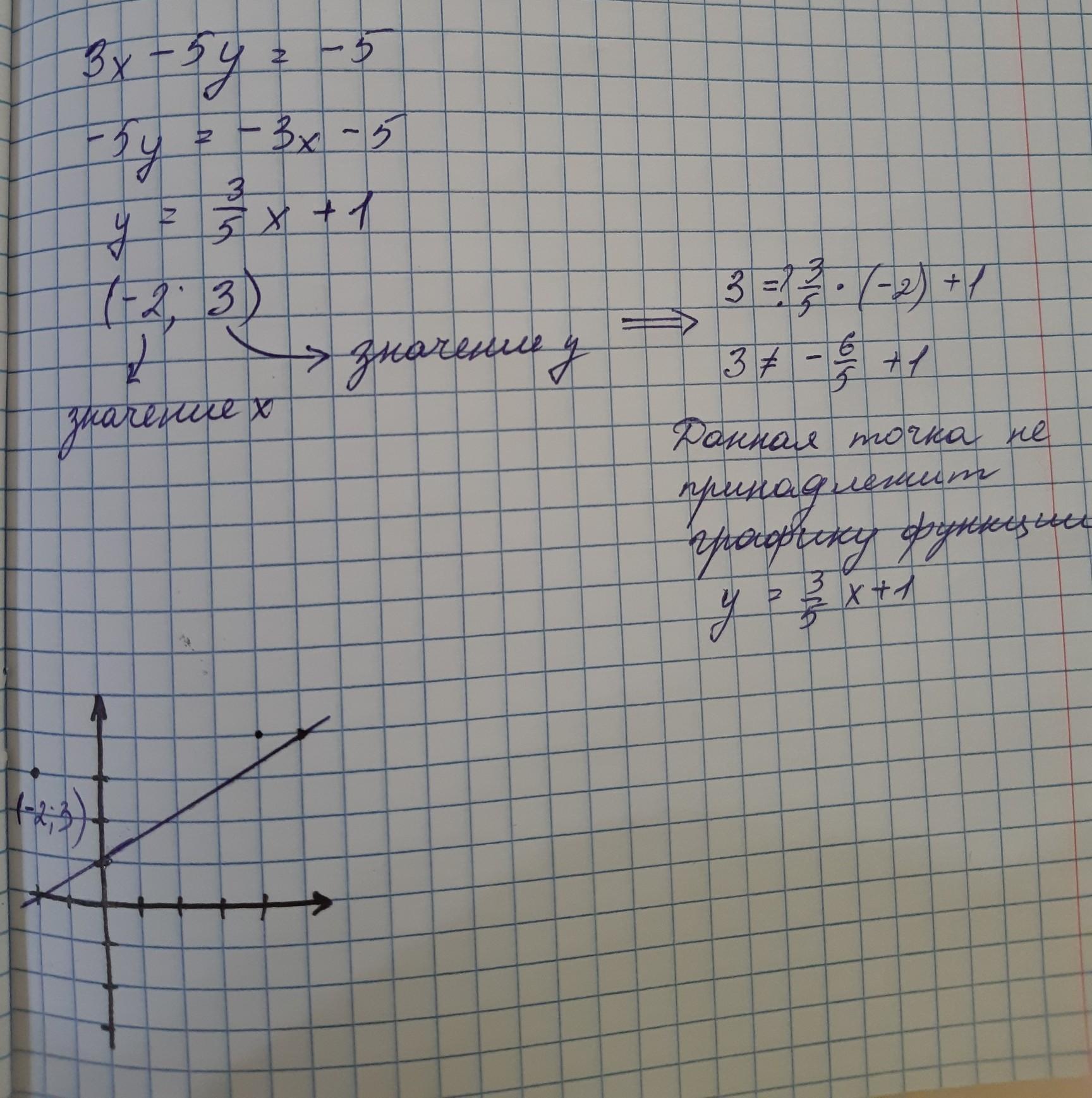 3) Принадлежит графику уравнения 3х – 5у = - 5 точка (-2; 3)? (начертить график и отметить точку)