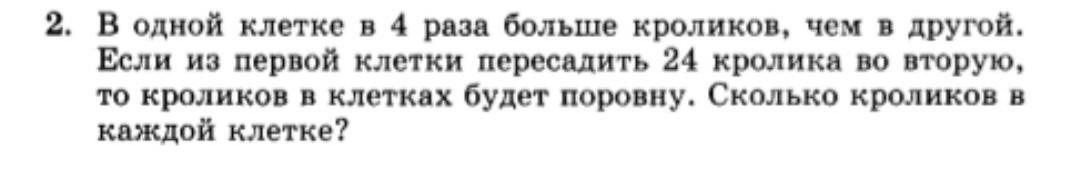 Пусть в одной клетке х, тогда во второй 4х. При этом 4х-24=х+24. Решаем уравнение, получаем 3х=48, х=16, а 4х=64