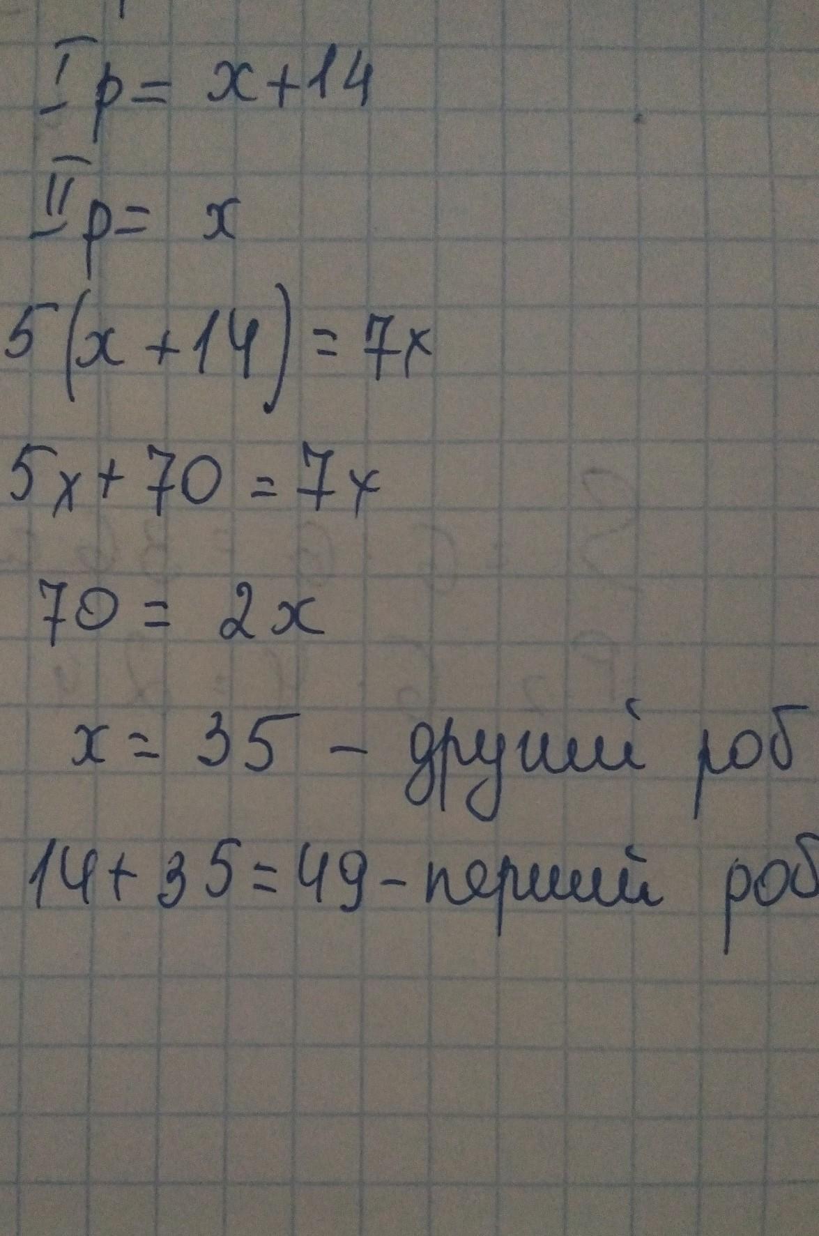 I робітник за 5 годин зробив таку саму кiлькiсть деталей, як II робітник за 7 годин. Скільки деталей за годину робили робітники, якщо II робітник вироблял на 14 деталей меньше, ніж I ?