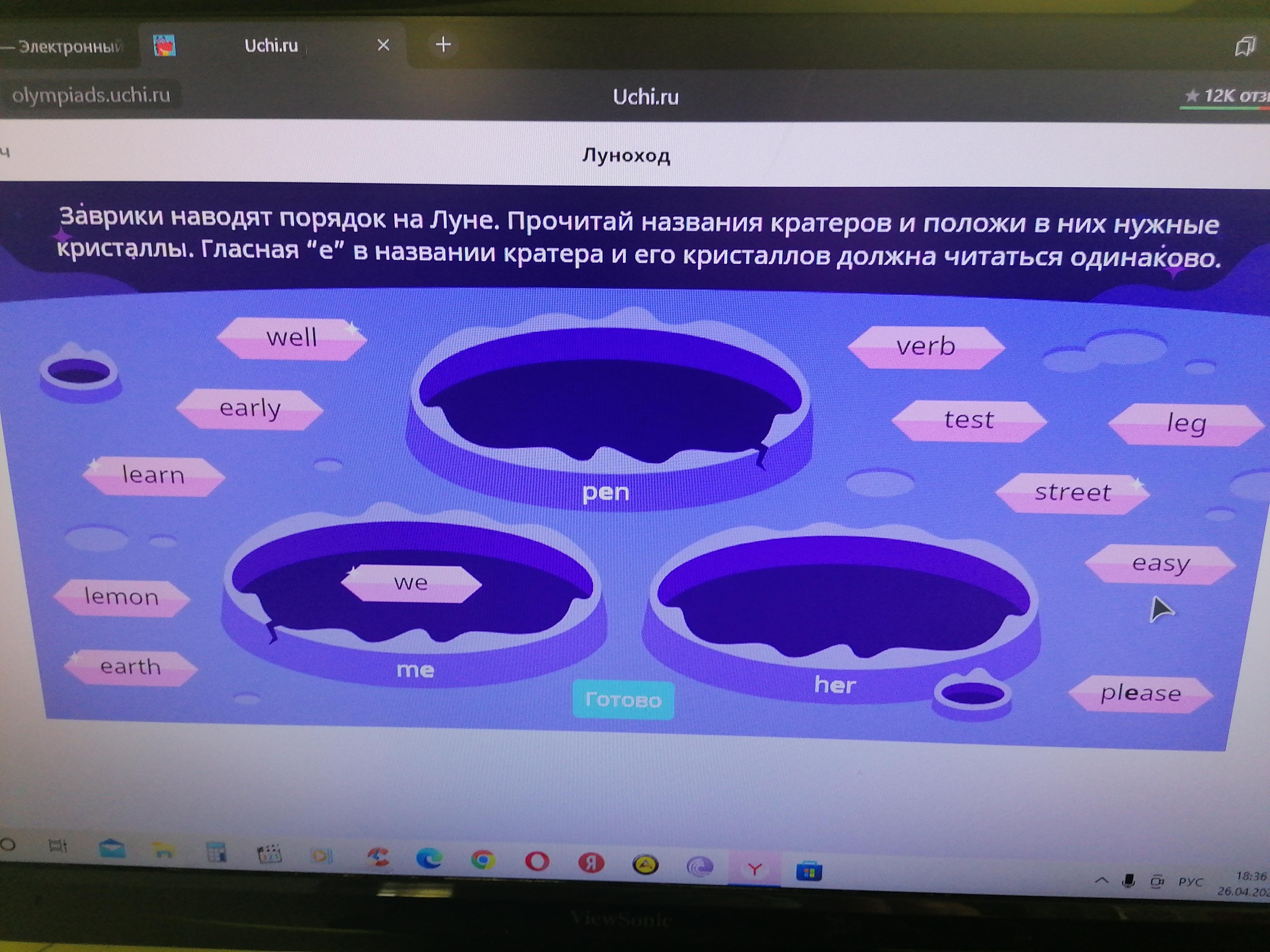 Заврики наводят порядок на Луне. Прочитай названия кратеров и положи в них нужные кристаллы. Гласная "е" в названии кратера и его кристаллов должна читаться одинаково. (задание брату