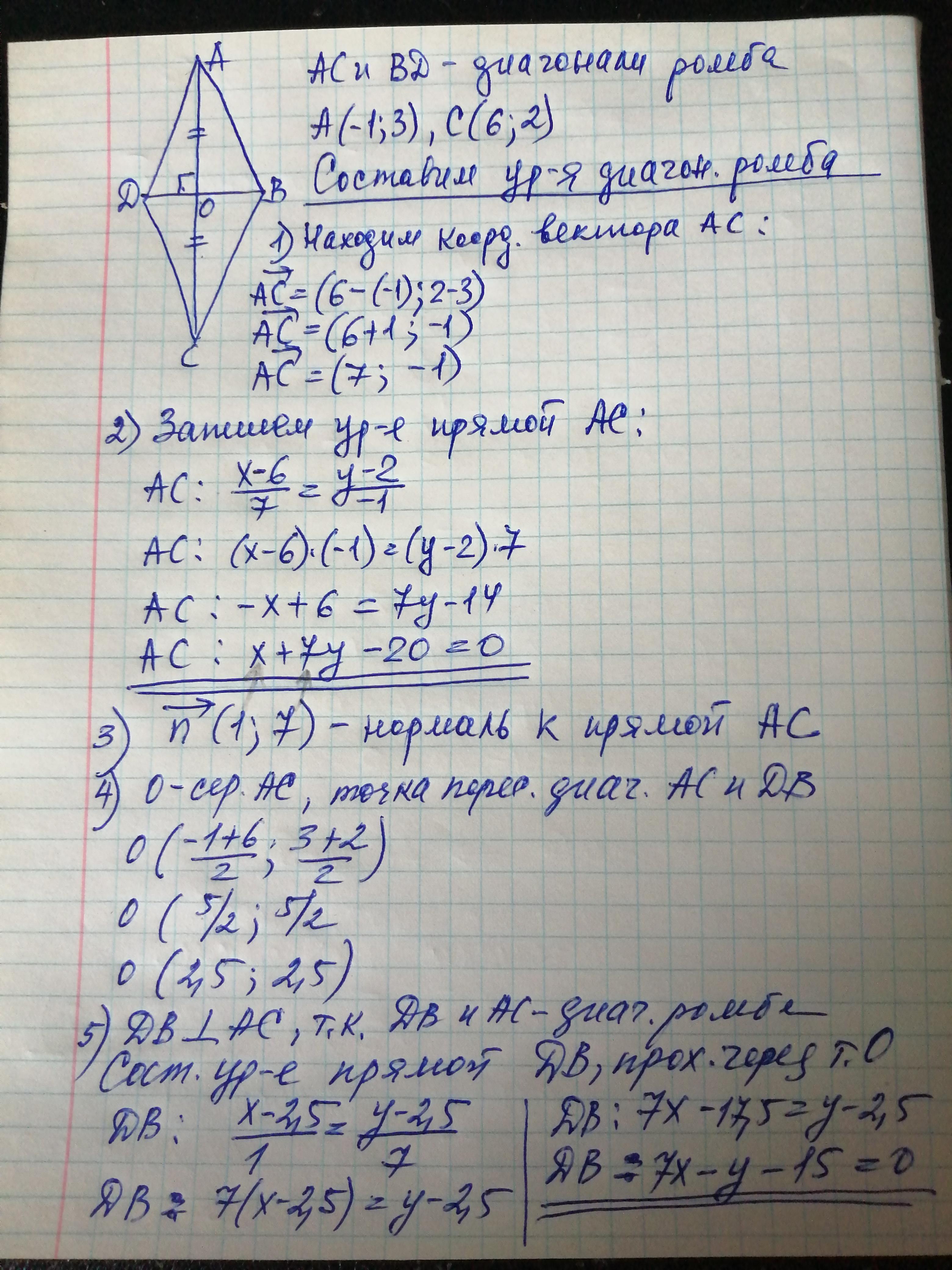 Даны две противоположные вершины ромба A (-1,3), C (6,2)