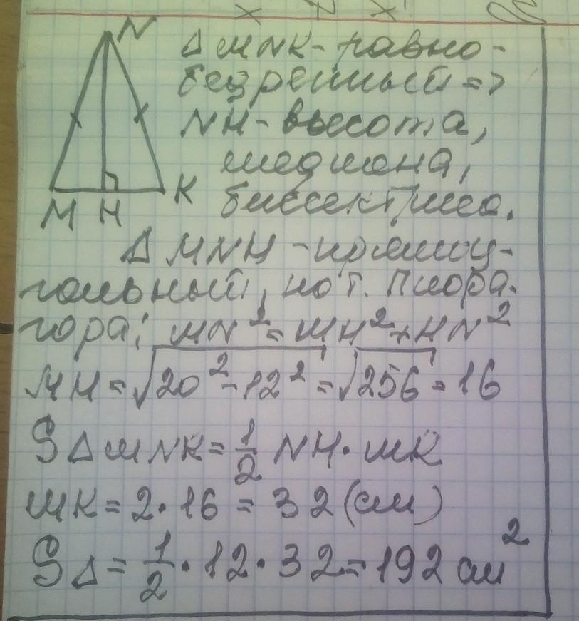 Обчисліть площу рівнобедреного трикутника, бічна сторона якого дорівнює 20 см, а висота, проведена до основи - 12 см.
