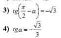 Решить уравнения 1) tg((π/2)-a) = -√3; 2) tg a = -(√3/3)