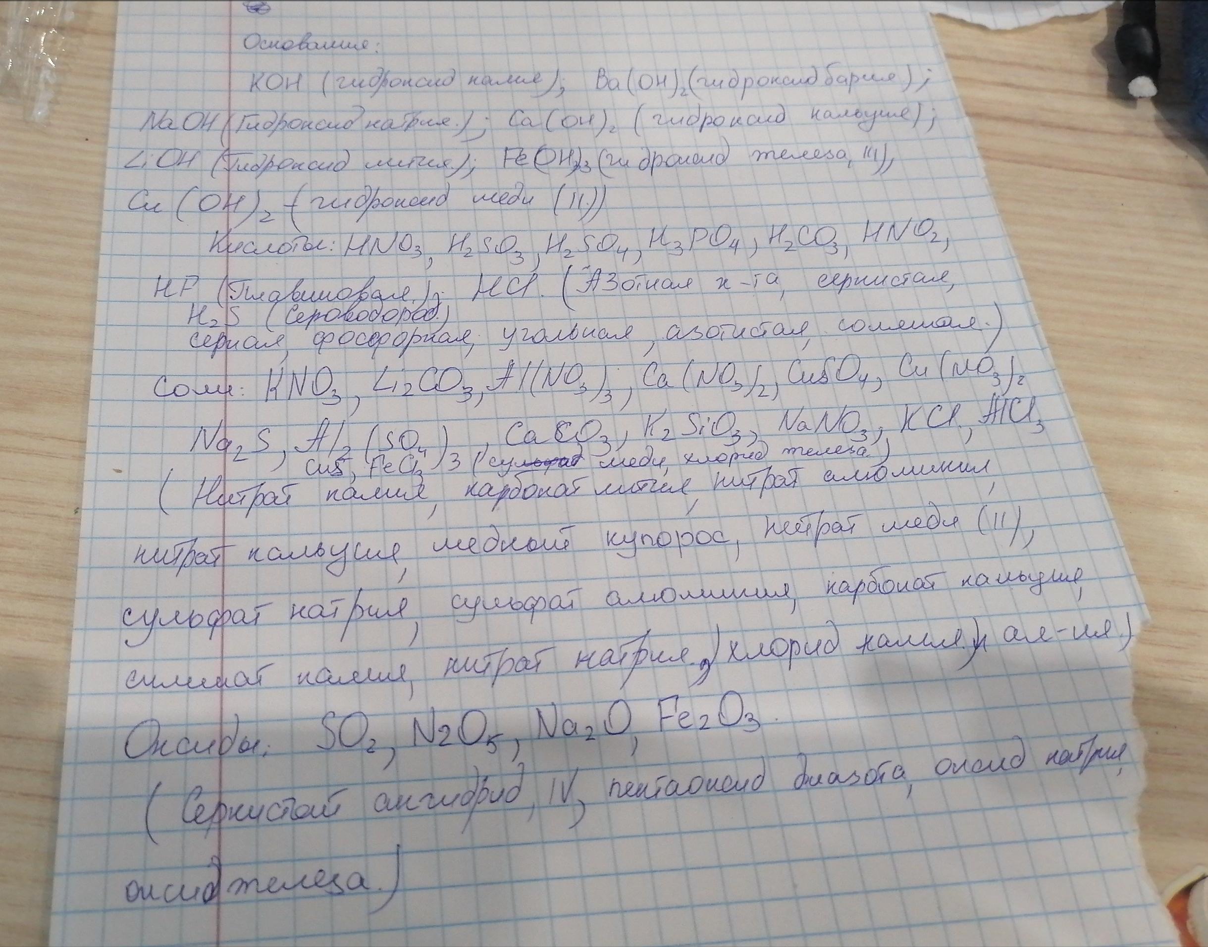 KOH, Ва(ОН)2, NaOH, Ca(OH)2, KOH, NaOH, LiOH 4) Fe(OH)3, Cu(OH)2, NaOH, КCl, HNO3, H2SO3, H2SO4, H2S, Ca(OH)2, H3PO4, Ca3(PO4)2, КNO3, К2O, HNO3, Li2СО3, Н2СО3, KOH 2) АlСl3, Al(NO3)3, Al2S3 , H2S, Ca(NO3)2, CaCl2, Cu(OH)2, CuSO4, CuS, HNO3, H2S, H2SO3, H2S, HNO2, Н3РО4, Н2СО3, H2S, HF, HCl, FeCl3, Na2S, SO2, N2O5, Cu(NO3)2, Al2(SO4)3, CaCO3, K2SiO3, H2SO4, Na2O,Fe2O3,H2S, NaNO3