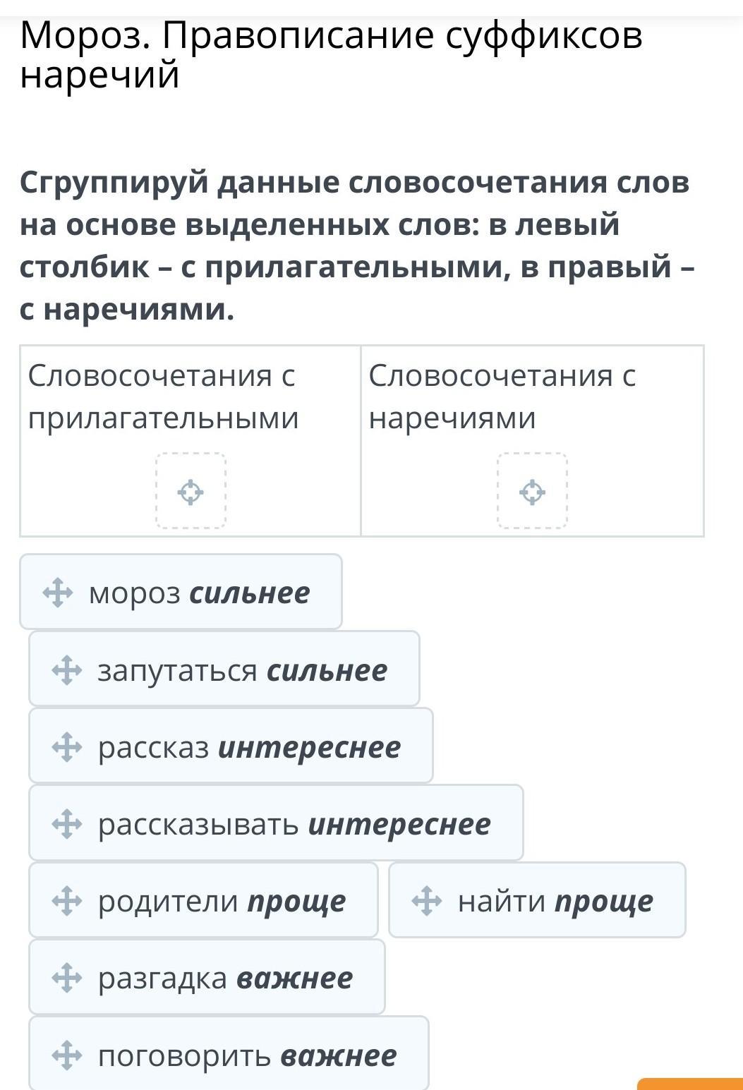 Мороз. Правописание суффиксов наречий Сгруппируй данные словосочетания слов на основе выделенных слов: в левый столбик – с прилагательными, в правый – с наречиями. Словосочетания с прилагательными Словосочетания с наречиями