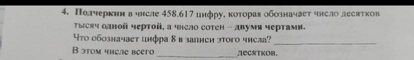 Подчеркни в числе 458.617 цифру, которая обозначает число десятков тысяч одной чертой, а число сотен - двумя чертами. Что обозначает цифра 8 в записи этого числа? В этом числе всего десятков. Помогите пожалуйста