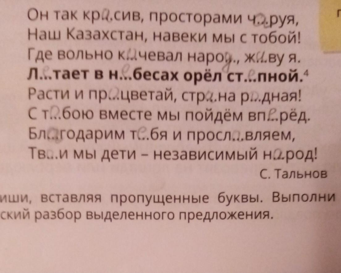 Он так красив, просторами чруя, простор Наш Казахстан, навеки мы с тобой! open Где вольно качевал народ., жаву я. Л...тает вн...бесах орёл ст...пной. Расти и пр...цветай, стр.на р...дная! Ст...бою вместе мы пойдём вп.ред. Благодарим т...бя и просл...вляем, Тв...и мы дети - независимый народ! С. Тальное Спиши, вставляя пропущенные буквы. Выполни синтакти- ческий разбор выделенного предложения. 41 пж помогите