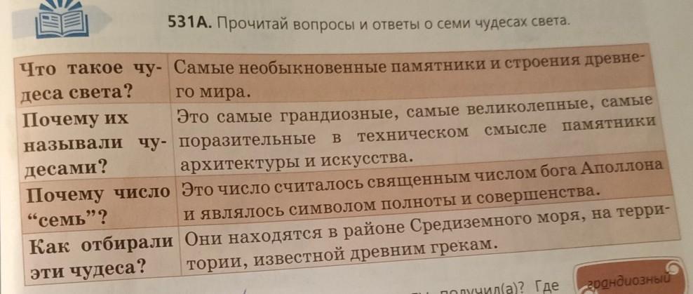 531Б.укакую информацию ты получил(а)? Где были созданы памятники и здания, считающиеся семью чудесами света? Почему по отношению к чудесам света используют прилагательные со словом самый? Чем отличается "чудесное место" от обычного?