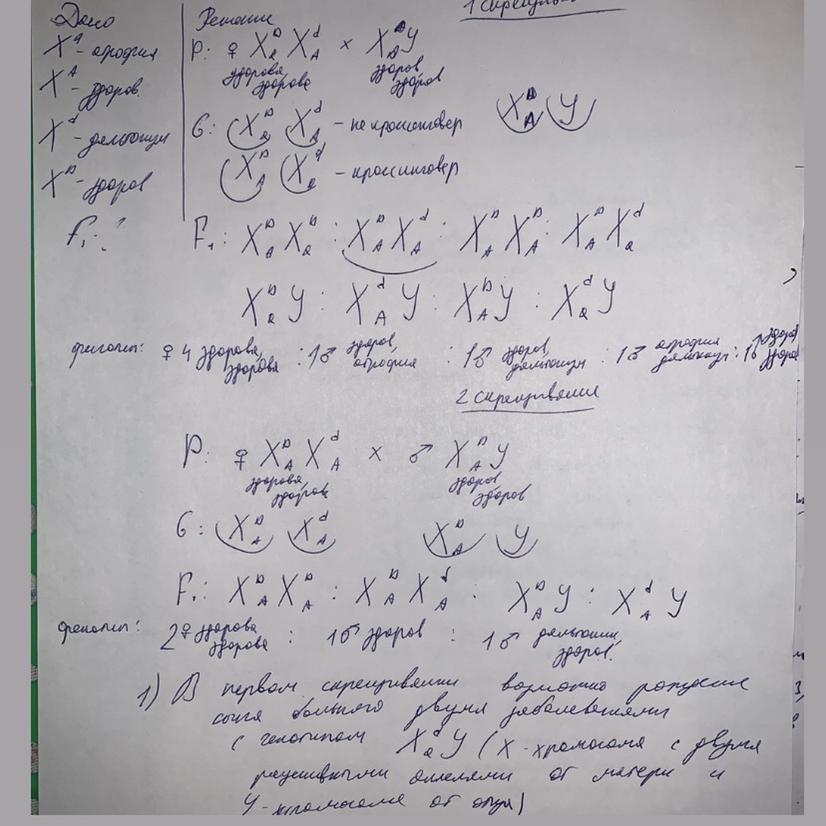 У человека между аллелями генов атрофии зрительного нерва и красно-зеленого дальтонизма происходит кроссинговер. Не имеющая таких заболеваний женщина, у матери которой был дальтонизм, а у отца - атрофия зрительного нерва, вышла замуж за мужчину, не имеющего таких заболеваний. Родившаяся в этом браке моногомозиготная здоровая дочь вышла замуж за мужчину, не имеющего таких заболеваний, в этой семье родился ребенок дальтоник. Составьте схемы решения задачи. Укажите генотипы, фенотипы родителей и генотипы, фенотипы, пол возможного потомства в двух браках. Возможно ли в первом браке рождение больного двумя заболевания ребенка. Ответ поясните.