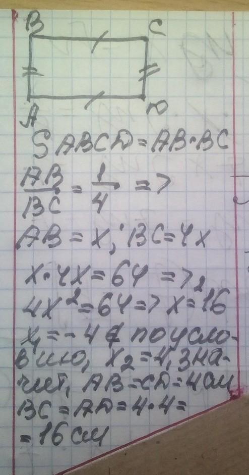 Площа прямокутника - 64 см2 . Знайдіть його сторони, якщо вони відносяться як 1:4
