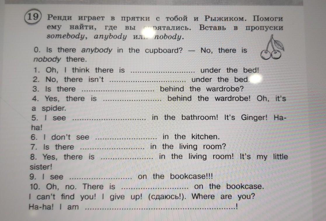 Ренди играет в прятки с тобой и Рыжиком. Помоги ему найти,где вы спрятались. Вставь в пропуски somebody, anybody или nobody