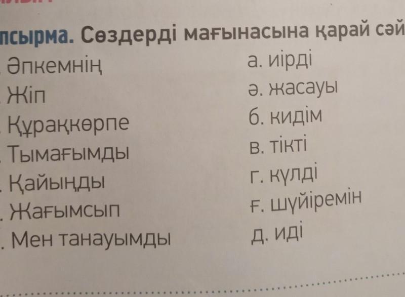 АЙТЫЛЫМ 4-тапсырма. Сөздерді мағынасына қарай сәйкестендір. a. иірді Ә. жасауы б. кидім 1. Әпкемнің 2. Жіп 3. Құрақкөрпе 4. Тымағымды 5. Қайыңды 6. Жағымсып 7. Мен танауымды B. тікті Г. Күлді ғ. шүйіремін Д. Иді