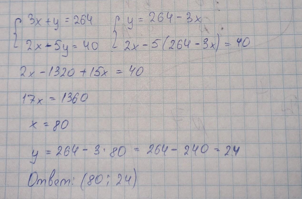 3x+y=264 {3(20+2,5y)=264 {60+7,5y=264 {7,5y=264:60=4.4 {y=4.4:7,5