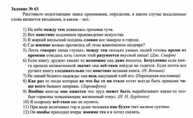 1) На небе, между тем, появилась грозовая туча. ( Между тем - вводное слово). 2) Вот поистине подлинное произведение искусства. 3) В жаркий июльский полдень словно все замерло в городе. 4) Где именно можно прочитать об этом живописном шедевре? 5) Лесть, говорят, пища глупых; между тем, сколько умных людей готовы время от времени отведать хоть глоток этой, разумеется, вкусной пищи! (Дж. Свифт) (Между тем, говорят, разумеется - вводные слова). 6) Если книгу дружно хвалят, то, возможно, она даже неплоха. Безусловно, если книга прошла незамеченной, значит, она всё-таки никуда не годится. Если почти все ругают книгу, следовательно, это поистине великая книга. (Н. Векшин). (Возможно, безусловно, значит, следовательно - вводные слова). 7) Не лишай бедного надежды: она ведь насущный хлеб его. (Персидская пословица) 8) Как раз те люди, которые во что бы то ни стало хотят всегда быть правыми, чаще всего бывают неправы. (Ларошфуко) 9) Вообще, иногда мне кажется, что труд, может быть, какие-то особые гормоны повышающие жизненный тонус. (Н. Н. Бурденко) (Вообще, может быть - вводные слова). 10) Я попрошу, всё-таки, вас не шуметь. (Все-таки - вводное слово). 11) При виде величавых гор в душе человека как будто тает мелкое, суетное. 12) Он, якобы, приходил вчера: именно это я и хотел сказать. (Якобы - вводное слово).