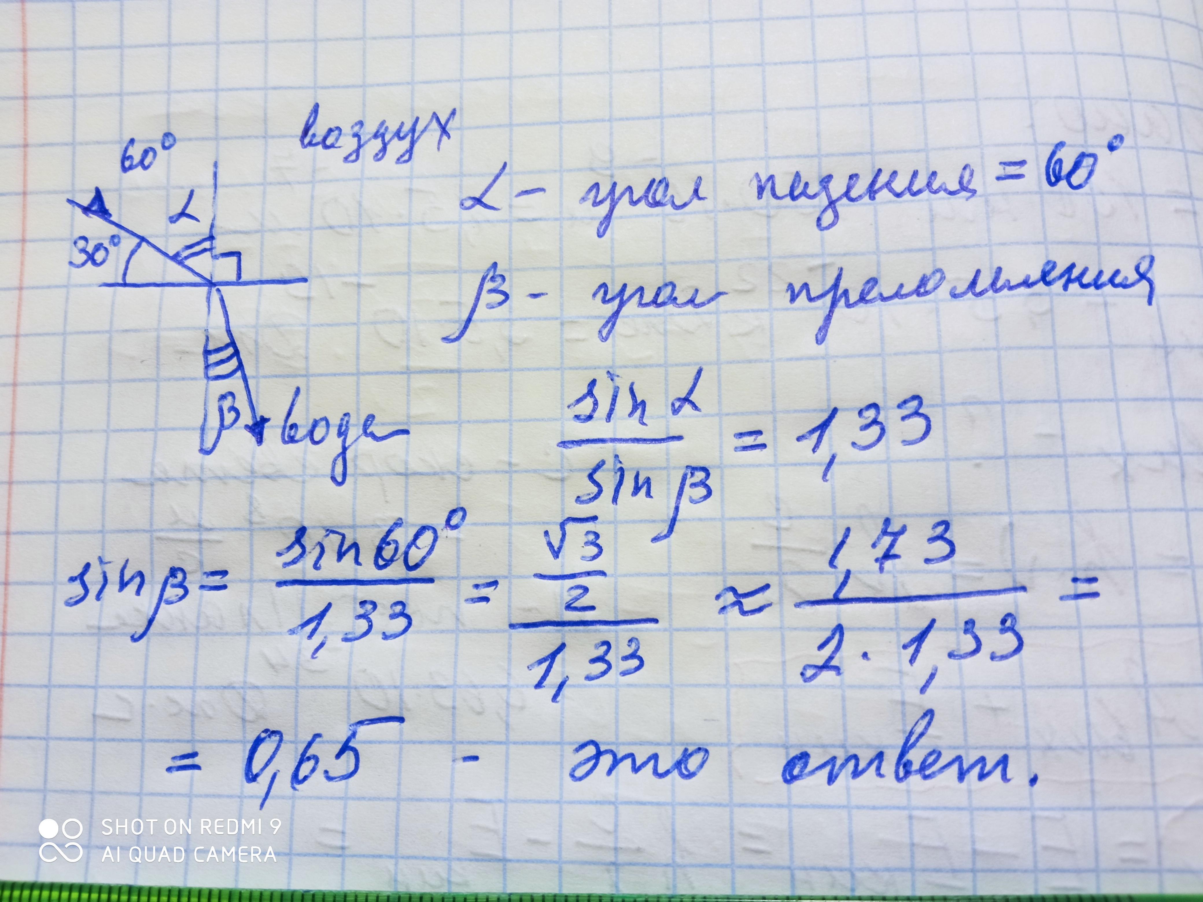 Луч света переходит из воздуха в воду. Чему равняется синус угла преломления, если угол между границей раздела двух сред и падающим лучом составляет 30°? Показатель преломления воды 1,33