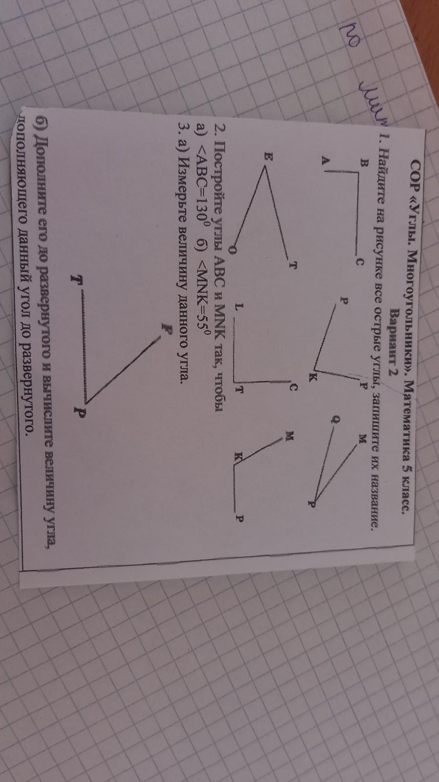 СОР «Углы. Многоугольники». Математика 5 класс. Вариант 2 1. Найдите на рисунке все острые углы, запишите их название. B F M с P K T с M L T KO P