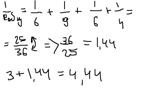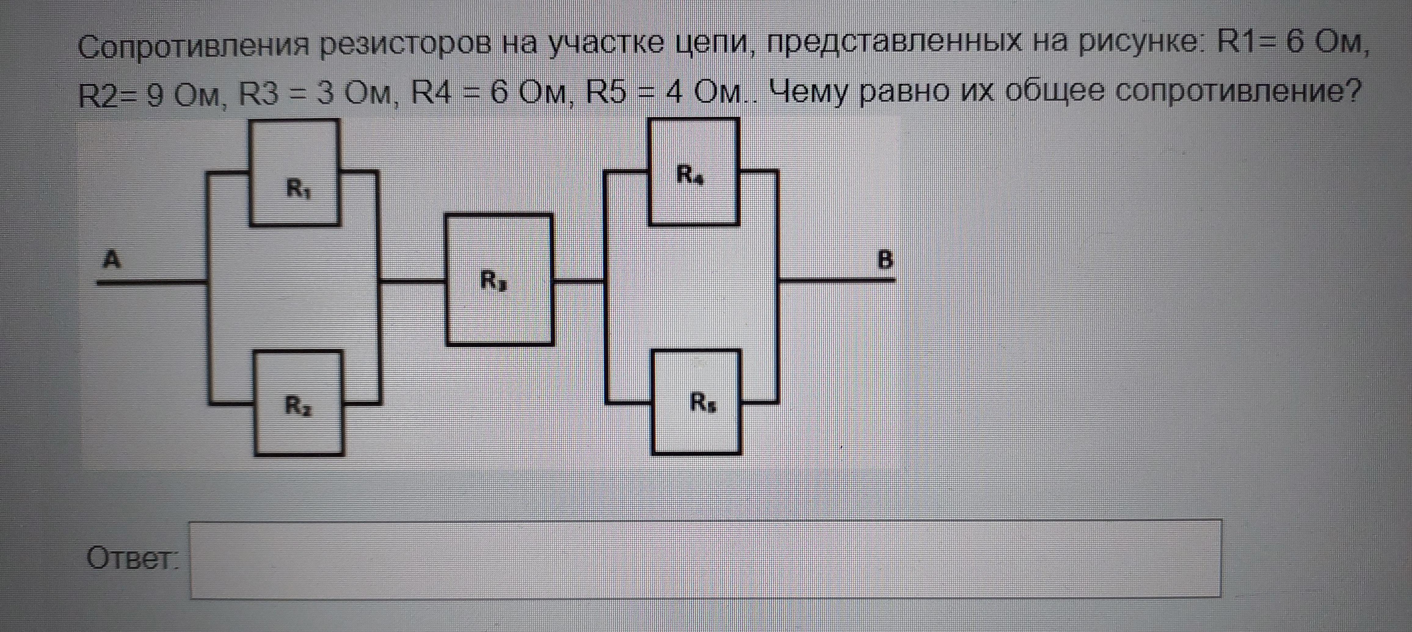 Сопротивления резисторов на участке цепи, представленных на рисунке: R1= 6 OM, R2= 9 OM, R3 = 3 Ом, R4 = 6 Ом, R5 = 4 Ом.. Чему равно их общее сопротивление?