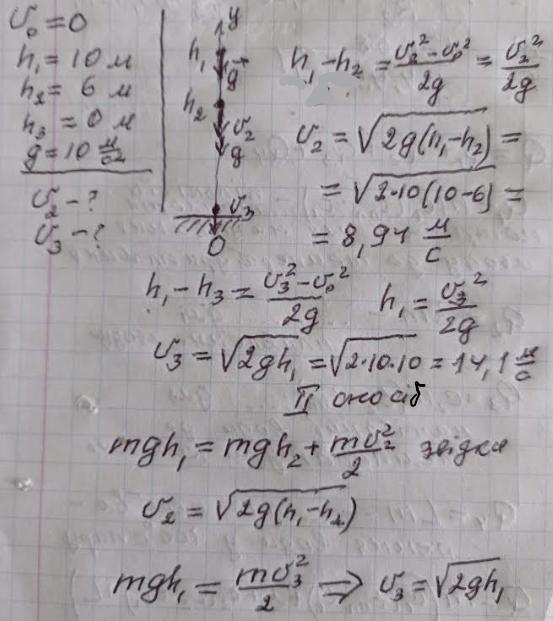 Тіло вільно падає з висоти 10 м. Яка його швидкість на висоті 6 м над поверхнею землі. Яка його швидкість на момент падіння на землю.