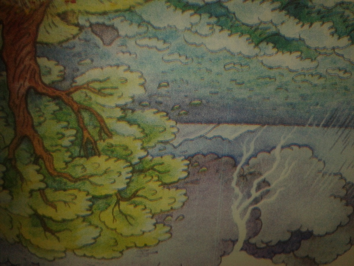 Непогода. Наплыли тучи и прогрохотал гром. Переливаясь розово-белыми ветвями на сиреневом фоне молния показывает свою мощь и величие. Молнии вспыхивают почти непрерывно одна за другой..