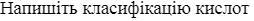 Ответ:здатних заміщуватися на атоми металічного елемента (за основністю кислоти), кислоти поділяють на одноосновні (HCl, HNO3), двохосновні (H2S, H2SO4), трьохосновні (H3PO4) тощо. За силою кислоти поділяють на сильні (HNO3, HI, HBr, HCl, H2SO4), кислоти середньої сили (H2SO3, H3PO4, HF, HNO2) та слабкі (H2CO3, H2S, H2SiO3).