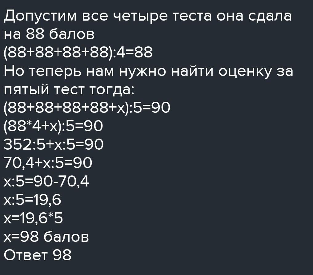 В університеті оцінка за семестр є середнім арифметичним оцінок за 5 тестів, які складають студенти протягом семестру. Найбільша можлива оцінка за кожний тест дорівнює 100 балам. Середня оцінка студентки Марії за чотири складені нею тести становить 88 балів. Скільки балів має отримати Марія за п'ятий тест, щоб її оцінка за семестр становила 90 балів?