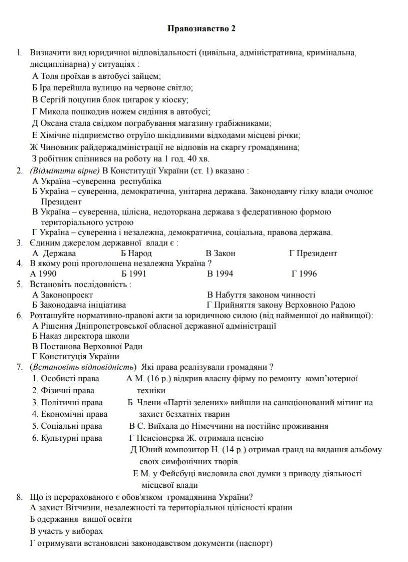 Правознавство 2 1. Визначити вид юридичної відповідальності (цивільна, адміністративна, кримінальна, дисциплінарна) у ситуаціях: А Толя проїхав в автобусі зайцем; Б Іра перейшла вулицю на червоне світло; В Сергій поцупив блок цигарок у кіоску; ГМикола пошкодив ножем сидіння в автобусі; ДОксана стала свідком пограбування магазину грабіжниками; Е Хімічне підприємство отруїло шкідливими відходами місцеві річки; ж Чиновник райдержадміністрації не відповів на скаргу громадянина; З робітник спізнився на роботу на 1 год. 40 хв. 2. (Відмітити вірне) В Конституції України (ст. 1) вказано : A Україна –суверенна республіка Б Україна – суверенна, демократична, унітарна держава. Законодавчу гілку влади очолює Президент В Україна – суверенна, цілісна, недоторкана держава з федеративною формою територіального устрою ГУкраїна — суверенна і незалежна, демократична, соціальна, правова держава. 3. Єдиним джерелом державної влади є: A Держава Б Народ В Закон ГПрезидент 4. В якому році проголошена незалежна Україна ? А 1990 Б 1991 В 1994 Г1996 5. Встановіть послідовність : A Законопроект В Набуття законом чинності Б Законодавча ініціатива ГПрийняття закону Верховною Радою 6. Розташуйте нормативно-правові акти за юридичною силою (від найменшої до найвищої): A Рішення Дніпропетровської обласної державної адміністрації Б Наказ директора школи В Постанова Верховної Ради ГКонституція України 7. (Встановіть відповідність) Які права реалізували громадяни ? 1. Особисті права AM. (16р.) відкрив власну фірму по ремонту комп'ютерної 2. Фізичні права техніки 3. Політичні права Б Члени «Партії зелених» вийшли на санкціонований мітинг на 4. Економічні права захист безхатніх тварин 5. Соціальні права ВС. Виїхала до Німеччини на постійне проживання 6. Культурні права ГПенсіонерка Ж. отримала пенсію ДЮний композитор Н. (14 р.) отримав гранд на видання альбому своїх симфонічних творів ЕМ. у Фейсбуці висловила свої думки з приводу діяльності місцевої влади 8. Що із перерахованого є обов'язком громадянина України? А захист Вітчизни, незалежності та територіальної цілісності країни Б одержання вищої освіти В участь у виборах Готримувати встановлені законодавством документи (паспорт)