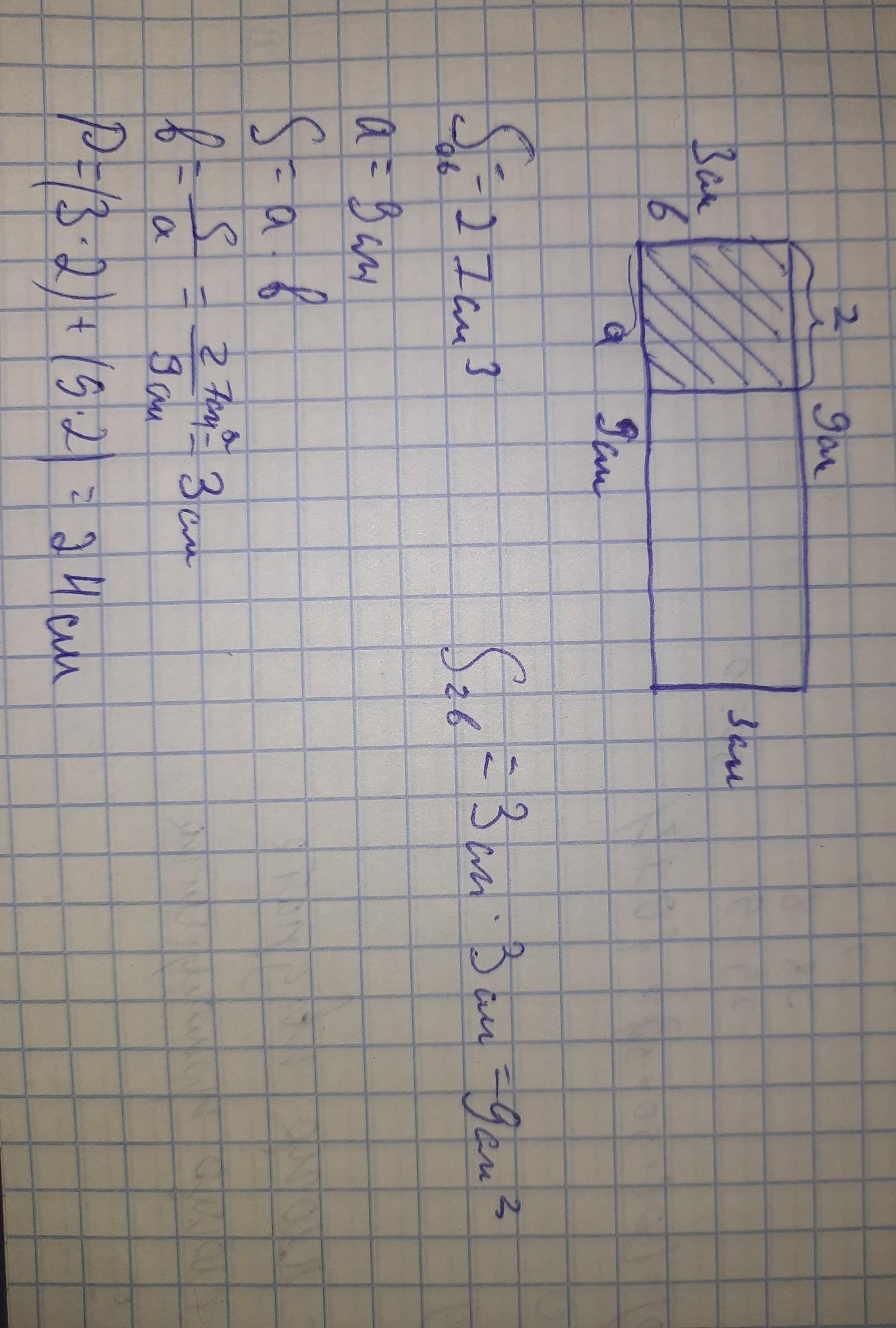 Помогите решить задачу: Площа прямокутника 27см2, довжина-9см. Знайти периметр прямокутника. Зафарбуйте 1/3 прямокутника. Яка площа зафарбованої частини?