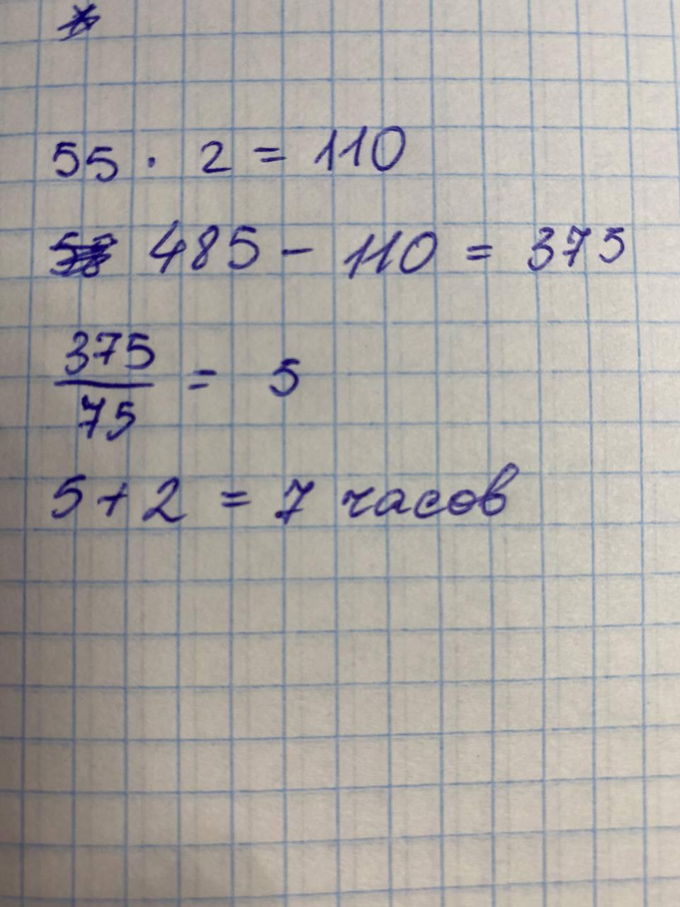 поезд прошёл 485 км . Первые 2 часа поезд шёл со скоростью 55 км ч а потом со скоростью 75 км ч . сколько время поезд затратил за весь путь