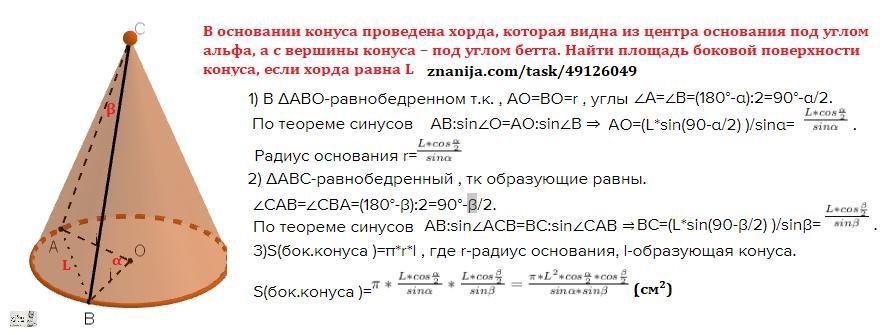 В основании конуса проведена хорда, которая видна из центра основания под углом альфа, а с вершины конуса – под углом бетта. Найти площадь боковой поверхности конуса, если хорда равна L
