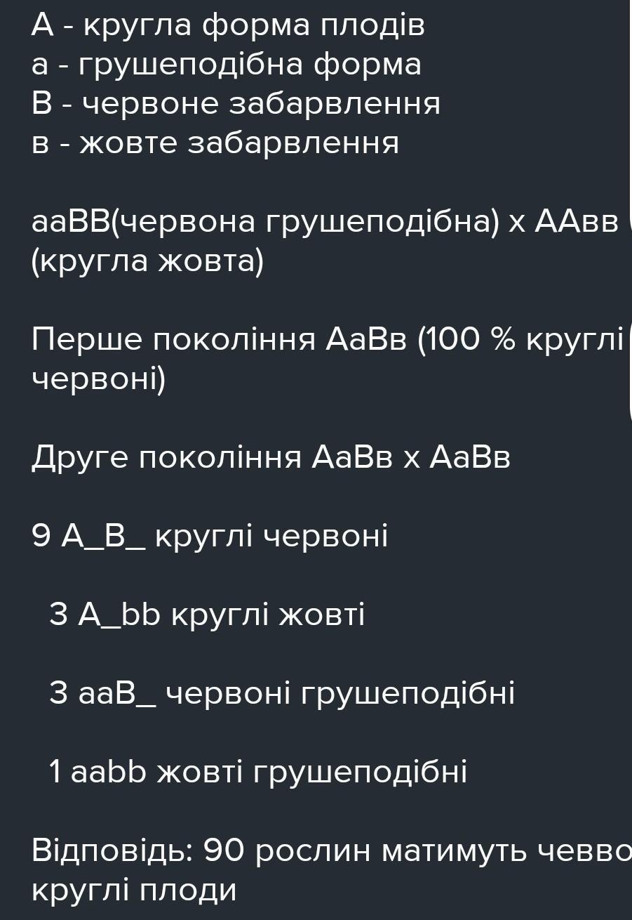 У помідорів кругла форма і червоне забарвлення плодів домінує над грушоподібною формою і жовтим забарвленням. Схрестили рослини двох сортів одну з червоними грушеподібними плодами із рослиною з круглими жовтими. У другому поколінні отримали 160 рослин скільки з них матимуть червоні круглі плоди?
