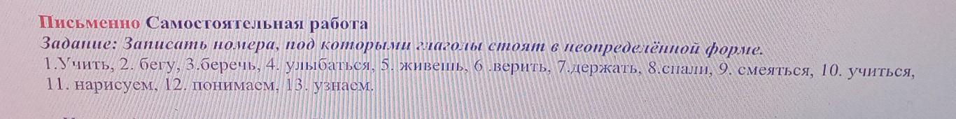 Письменно Самостоятельная работа Задание: Записать номера, под которыми глаголы стоят в неопределённой форме. 1.Учить, 2. бегу, 3.беречь, 4. улыбаться, 5. живешь, 6 верить, 7.держать, 8.спали, 9. смеяться, 10. учиться, 11. нарисуем, 12. понимаем, 13. узнаем.